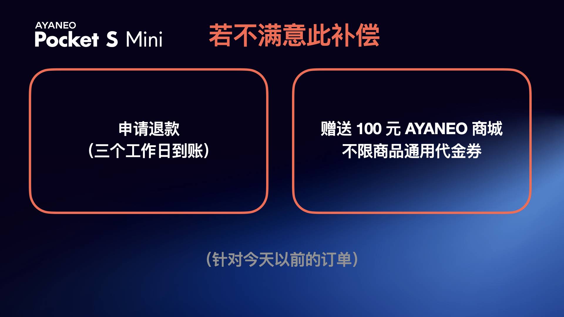 如对上述补偿方案仍不满意,用户亦可选择以下方案:可申请全额退款,款项将在 3 个工作日内原路退回;我们还将赠送 100 元 AYANEO 商城不限商品通用代金券。此方案适用于 2026 年 2 月 2 日之前的订单。