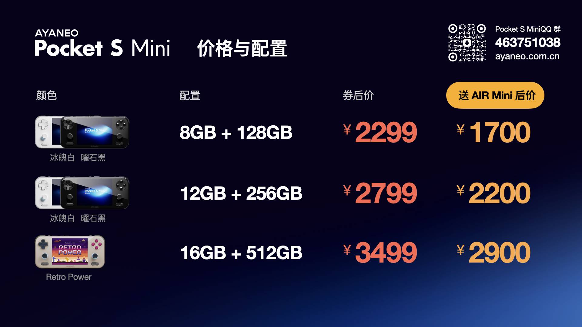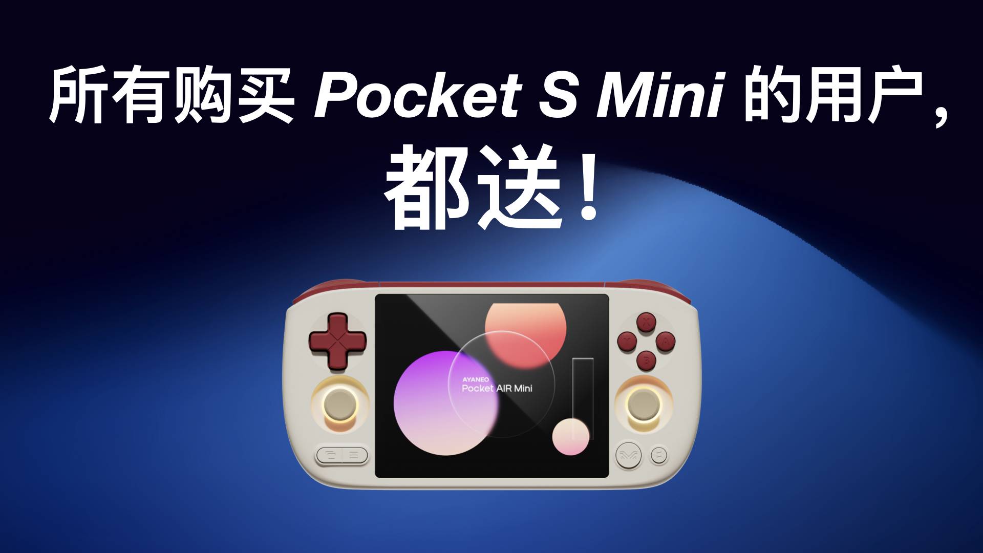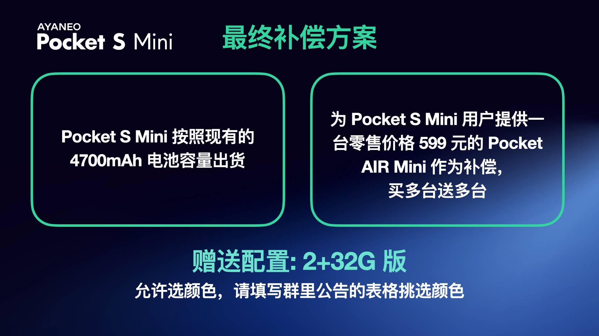 为 Pocket S Mini 用户提供一台零售价格 599 元的 Pocket AIR Mini 作为补偿,买多台送多台 (赠送的 Pocket AIR Mini 配置为 2GB + 32GB,并允许玩家选择颜色,请填写社群里公告的表格挑选颜色,玩家还可以补 100 元差价获得 3 GB + 64GB 版本的 Pocket AIR Mini )