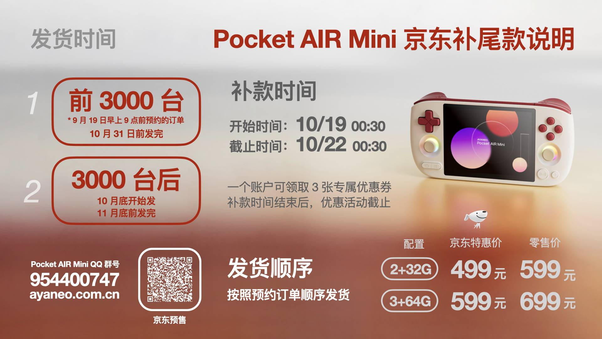 参与 10 元预约活动的玩家,可享受 AYANEO Pocket AIR Mini 2GB + 32GB 版本京东特惠价为 499元,3GB + 64G 版京东特惠价为 599元,欢迎玩家访问京东 AYANEO 官方旗舰店付尾款。特惠价格付尾款截止日期为 10 月 22 日 0 点 30 分,参与预约的玩家朋友一定要把握良机。对于发货时间,我们也做出了细致的安排,详见图示。我们也期待着玩家尽快上手体验这款诚意满满的复古小掌机。