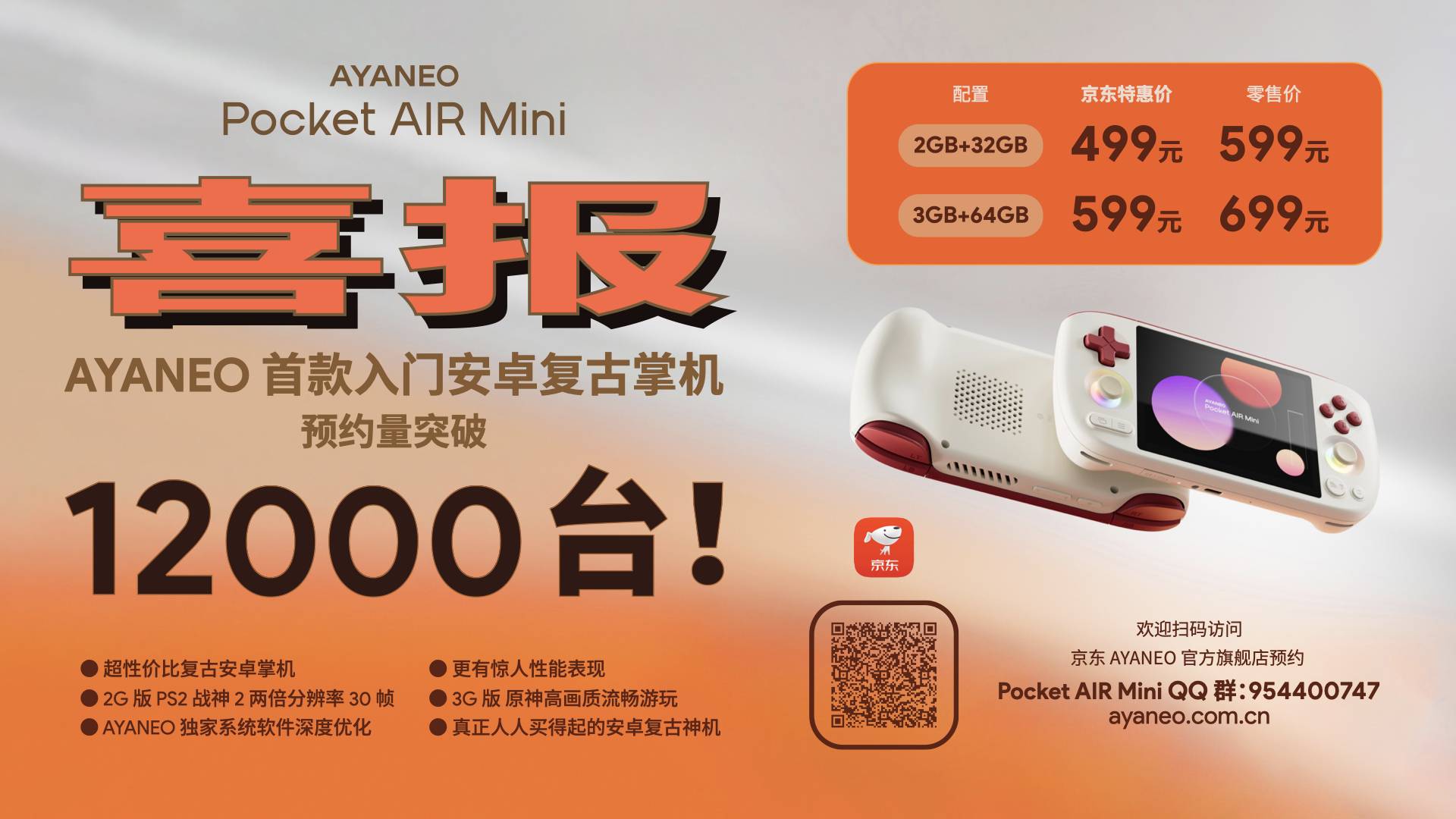 AYANEO Pocket AIR Mini 京东预约量已突破 12000 台,感谢玩家朋友的支持! 参与预约活动的玩家欢迎访问京东 AYANEO 旗舰店付款,时间有限,莫失良机。