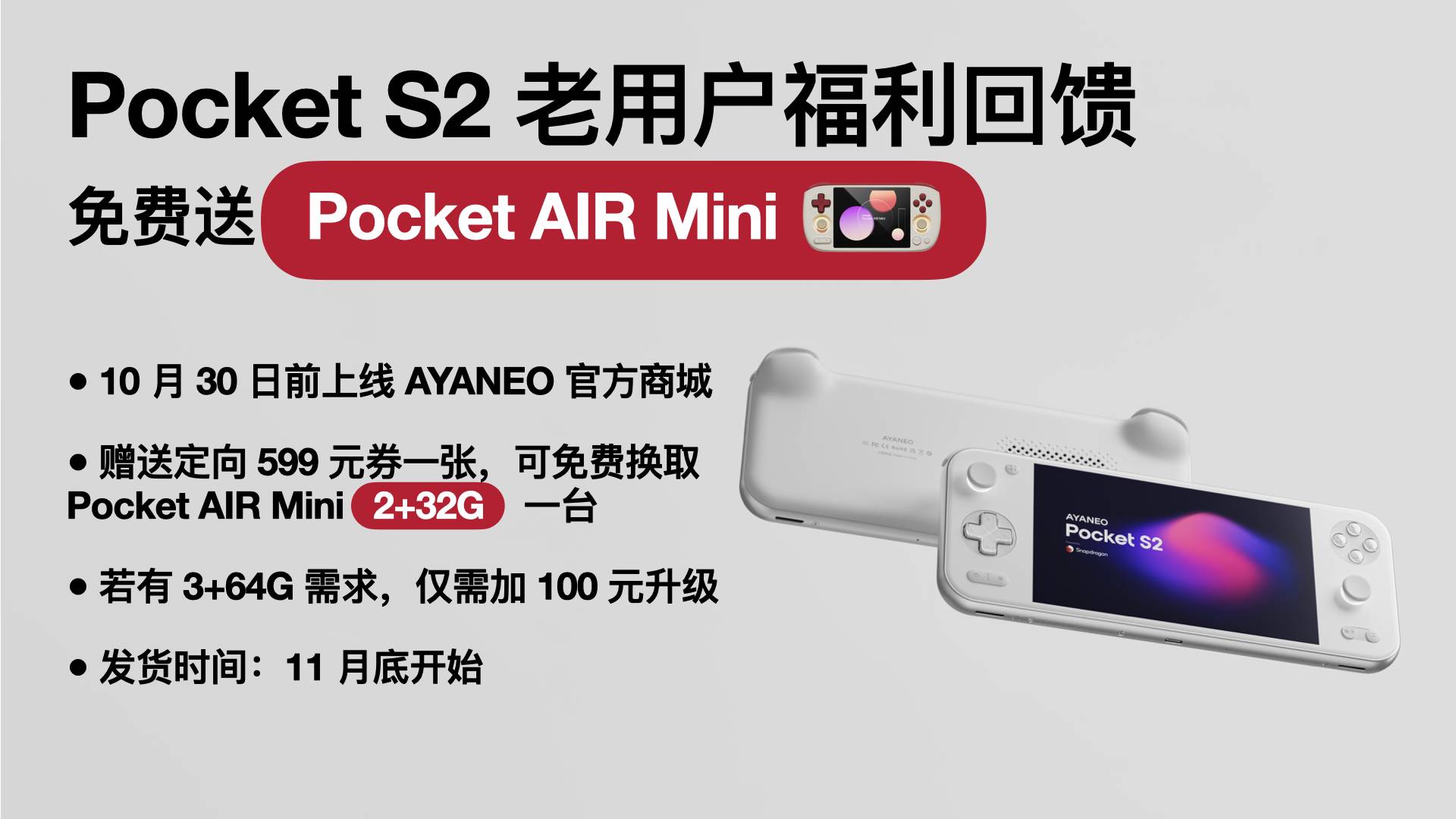 为了感谢玩家一直以来的支持与厚爱,我们如约为 Pocket S2 老用户带来福利回馈,免费送 Pocket AIR Mini 一台,欢迎玩家 10 月 30 日前上线 AYANEO 官方商城按照官方指引领取。