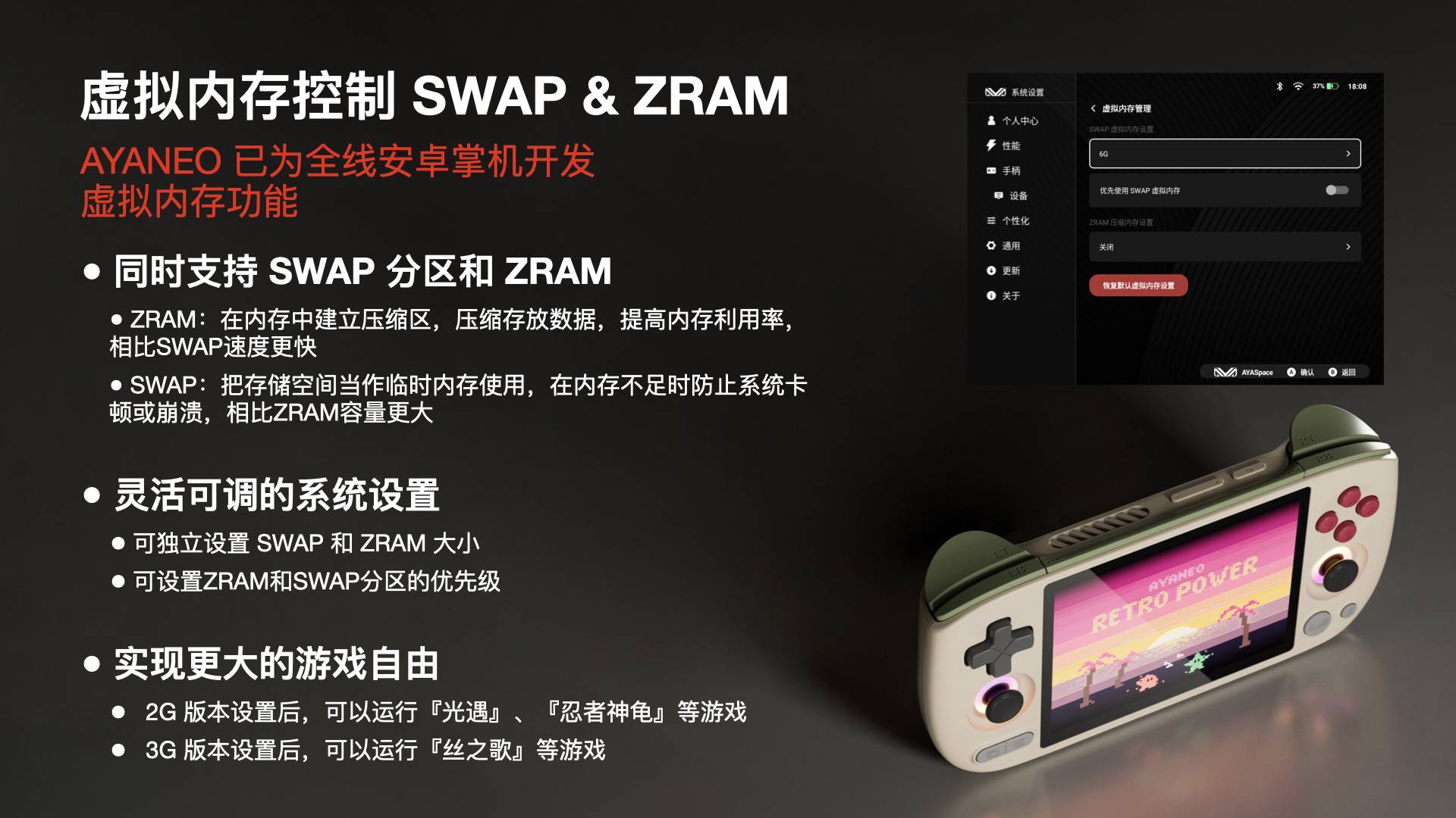 为了给 Pocket AIR Mini 2G & 3G 内存打造流畅游戏体验,我们深入 Android 系统和内核,进行精细化裁剪、替换、调优;针对性地优化内存管理、CPU / GPU 调度和 I / O 策略,优化底层调度;并采用定制的启动器、部分系统 Ul 框架;搭载轻量级 UI 与组件,少数内置应用采用优化的 Go 版本了;移除冗余的系统级模块,如不常用的语言包、输入法等,从而实现流畅游戏运行体验。与此同时, AYANEO 已为全线安卓掌机开发虚拟内存功能,同时支持 SWAP 分区和 ZRAM,支持灵活可调的系统设置,实现更大的游戏自由。