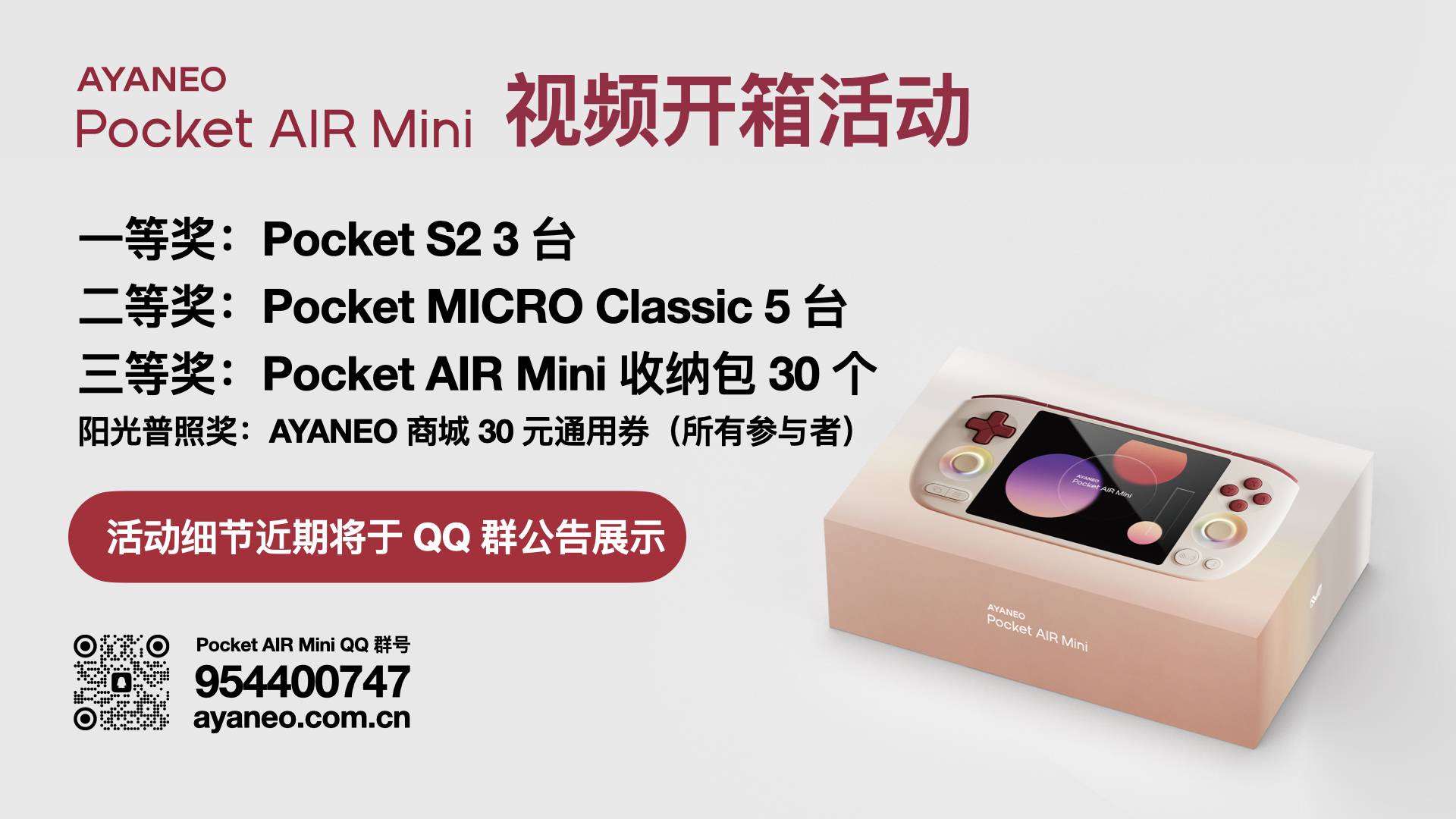Pocket AIR Mini 发货在即,我们欢迎所有收到爱机的玩家参与视频开箱活动,有机会获取丰富的奖品,活动细节将于近期在官方社群公布,敬请期待。